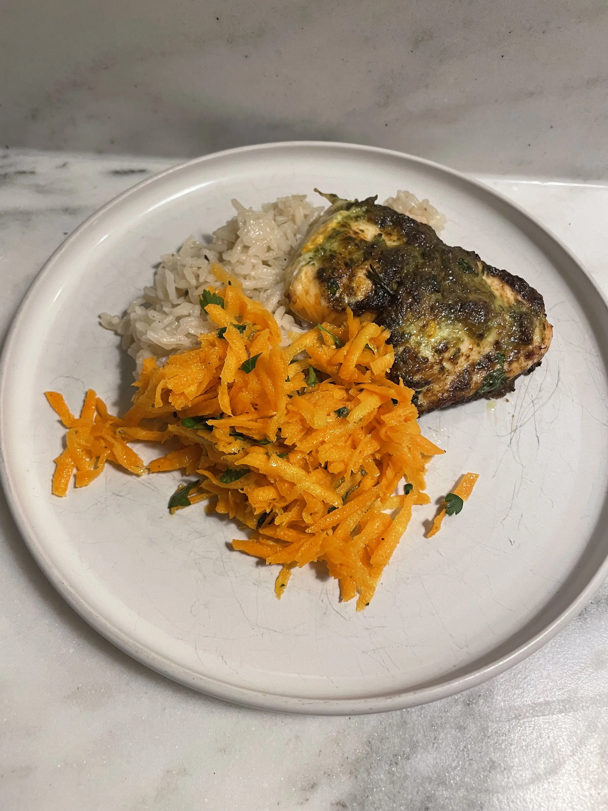 Friday- Air fryer salmon is one of favorite things. I topped some with mayo and buffalo sauce and some with mayo and zhoug- both were good. Served with rice and carrot salad.